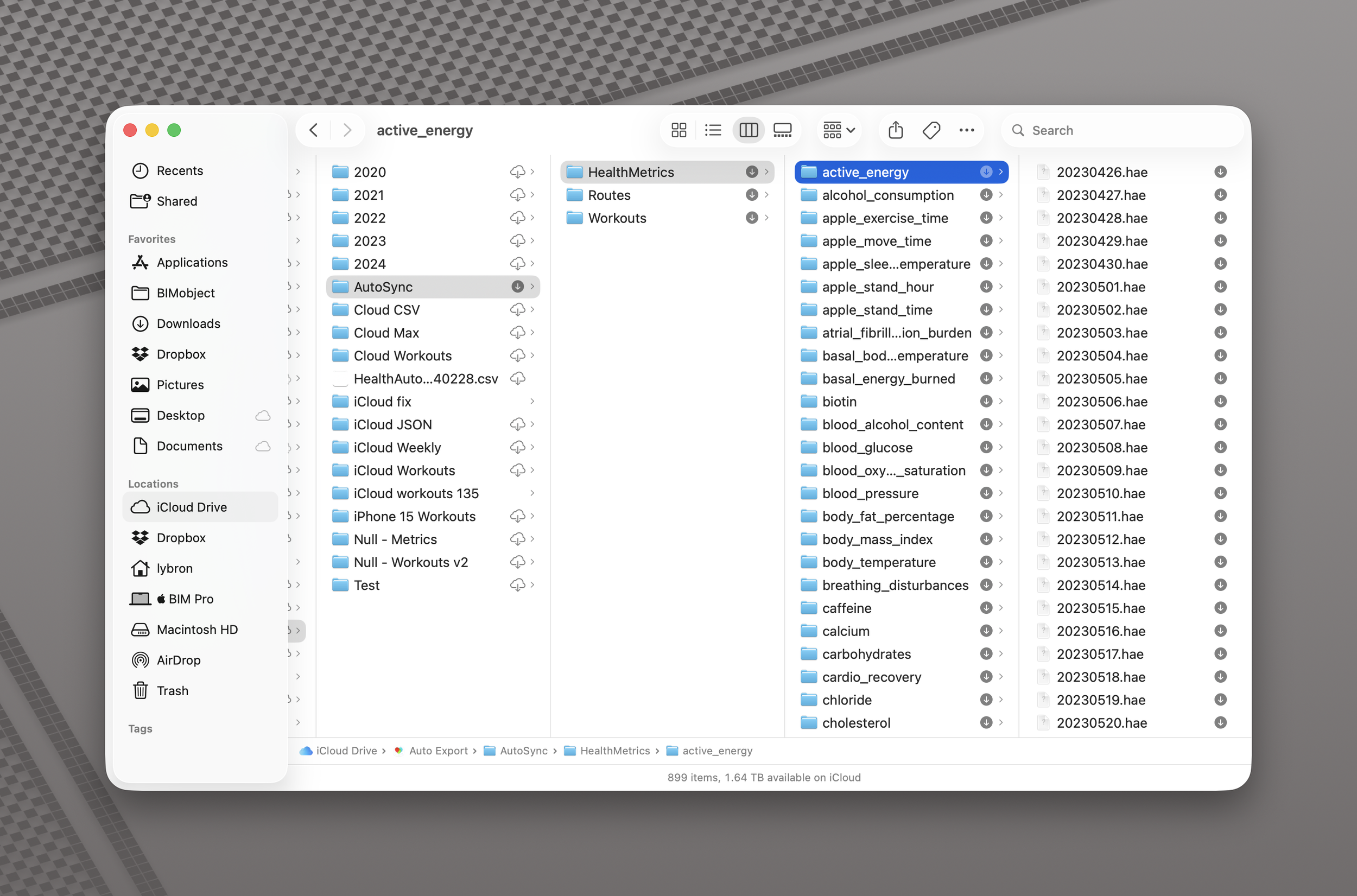 Use Finder to navigate to the Auto Sync folder in iCloud Drive on your Mac. This will follow the hierarchy: iCloud Drive > Health Auto Export > Auto Sync.